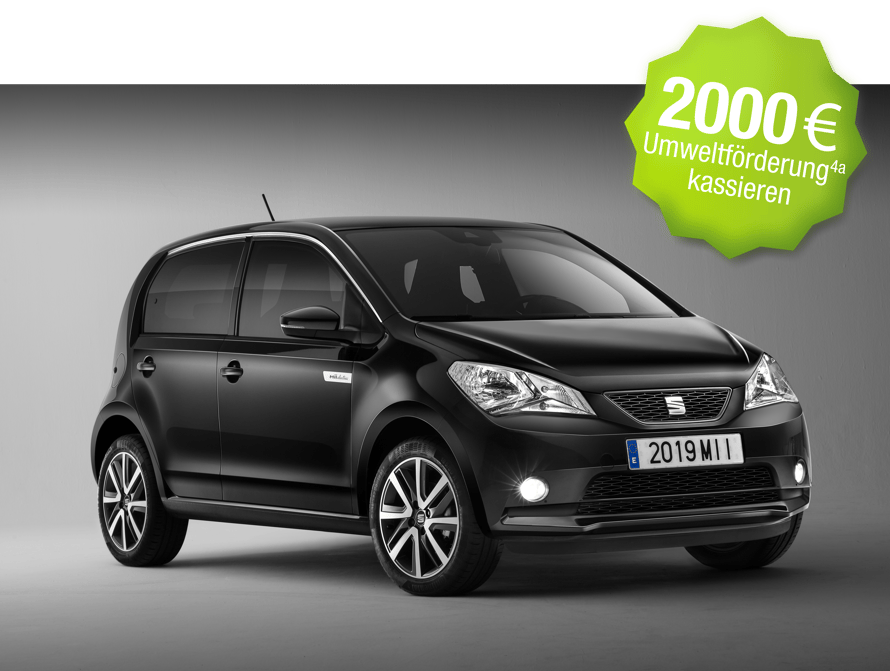 4 Der Vorteil von 4.380 € brutto setzt sich zusammen aus der SEAT eMobilitäts-Prämie von 2.380 € brutto und der staatlichen Förderung in Höhe von 2.000 € brutto⁴a. SEAT eMobilitäts-Prämie: Die SEAT Deutschland GmbH, Max-Planck-Str. 3-5, 64331 Weiterstadt, gewährt eine Prämie in Höhe von 2.380 € brutto beim Kauf eines neuen Mii electric. Verfügbar für Privatkunden und gewerblichen Endkunden. Weitere Informationen erhältst du bei deinem SEAT Partner. Die SEAT eMobilitäts-Prämie ist nicht kombinierbar mit Förderprogramm-Aktionen (mit Ausnahme der Basis Konditionen Leasing und Finanzierung).